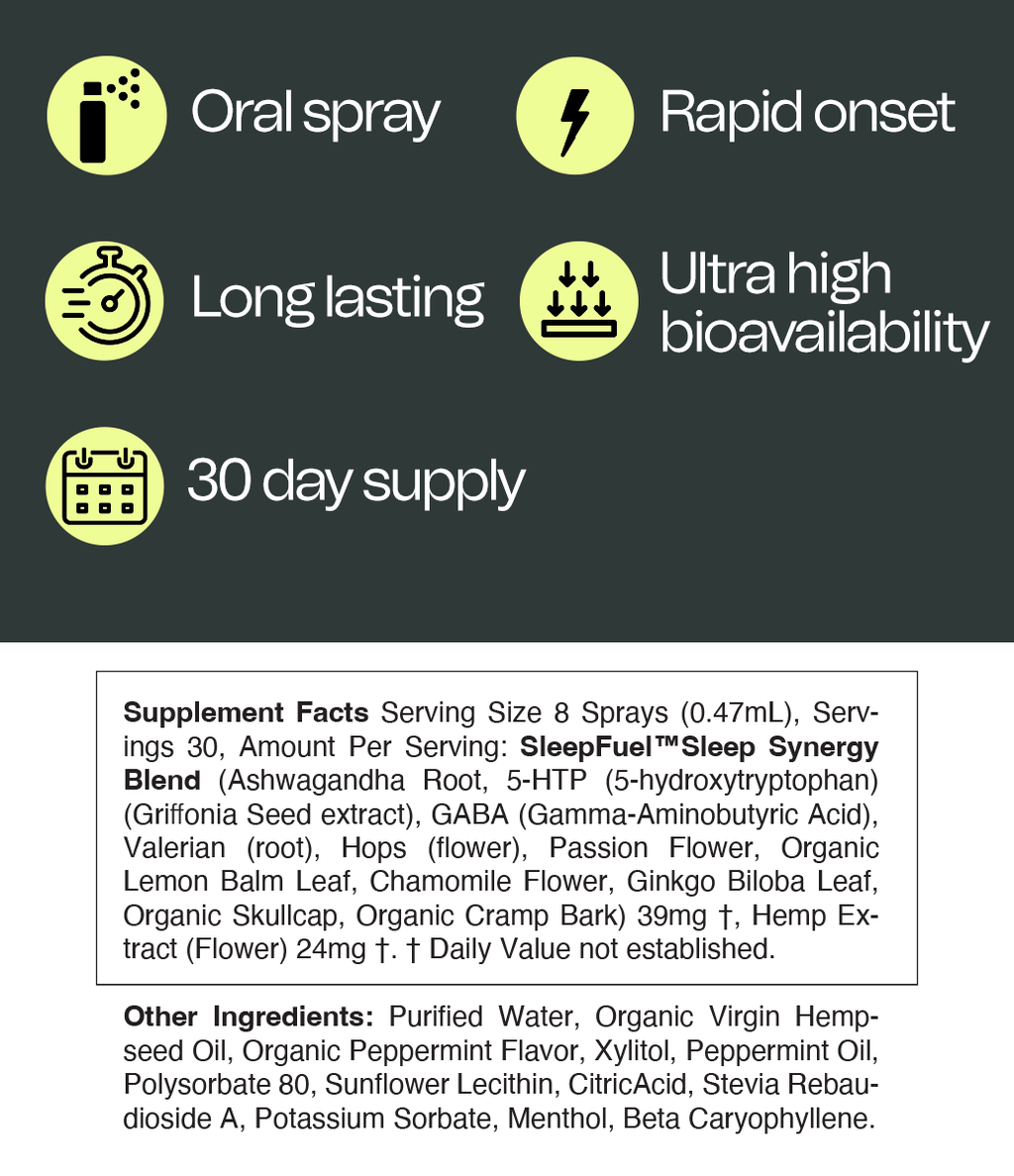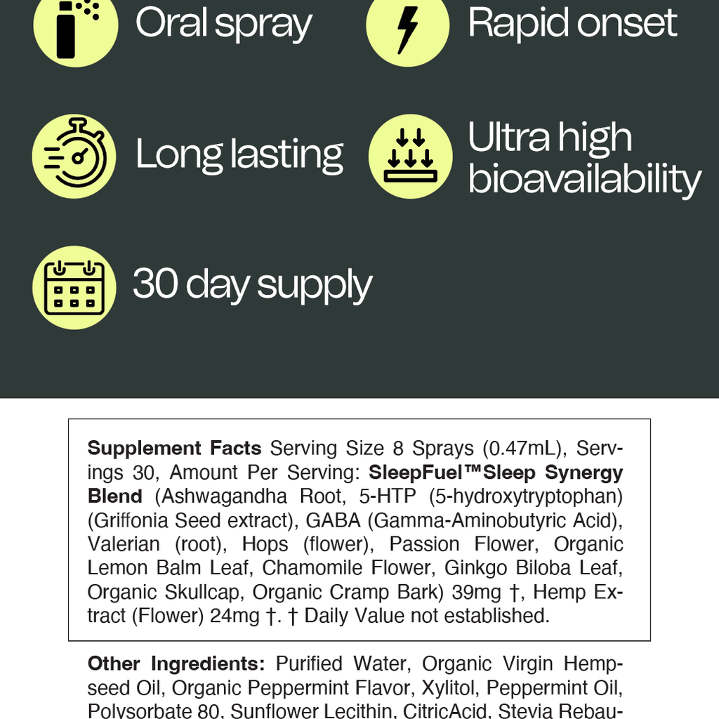Supplement Facts Serving Size 8 Sprays (0.47mL), Servings 30, Amount Per Serving: SleepFuel™ Sleep Synergy Blend (Ashwagandha Root, 5-HTP (5-hydroxytryptophan) (Griffonia Seed extract), GABA (Gamma-Aminobutyric Acid), Valerian (root), Hops (flower), Passion Flower, Organic Lemon Balm Leaf, Chamomile Flower, Ginkgo Biloba Leaf, Organic Skullcap, Organic Cramp Bark) 39 mg †, Hemp Extract (Flower) 24 mg †. † Daily Value not established.